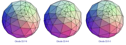 Chaque facette de l'icosaèdre est un triangle équilatéral, que l'on va subdiviser en triangles plus petits qui sont ensuite déformés (par projection radiale) pour être amenés sur la sphère circonscrite à l'icosaèdre. Voici trois exemples de géodes, correspondant chacun à une subdivision différente :