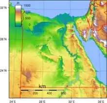 Le territoire de l'Égypte est constitué principalement de désert. Seuls 35 000 km2 - soit 3.5 % - de la superficie du pays est cultivée et habitée de manière permanente. L'essentiel du territoire égyptien se situe à l'intérieur de la large bande désertique qui s'étend d'ouest en est depuis la côte Atlantique de l'Afrique jusqu'en Asie du sud-ouest.