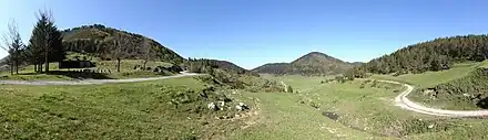 Les Pyrénées audoises : paysage au sommet du pech de Bugarach, et en arrière-plan, le pic de Madrès, dans le sud.