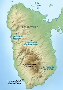La Basse-Terre à l'ouest, 848 km2 (massif ovale de 45 km sur 20), montagneuse et recouverte d'une forêt tropicale très dense du nord au sud, où abondent de nombreuses rivières et cascades, est d'origine volcanique comme certaines îles voisines (Dominique, Montserrat, Sainte-Lucie). Le plus haut sommet est le volcan en activité de la Soufrière culminant à 1 467 mètres, soit la plus haute altitude des Petites Antilles. Comme dans la plupart des îles volcaniques, on y trouve aussi de nombreuses plages de sable noir et de sable roux.