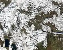 Une grande partie de la Macédoine du Nord est montagneuse. 45 % de la surface du pays est à une altitude comprise entre 500 et 1 000 m[1] et la plupart des sommets culminent entre 1 600 et 2 000 m[2]. Le pays est limité au nord par les monts Šar, dont les versants nord sont en Serbie et au Kosovo, le Pinde et la dépression du lac d'Ohrid à l'ouest, les contreforts du mont Olympe au sud et par le Pirin, situé principalement en Bulgarie, à l'est. Les massifs du Kozuf et du Nidže occupent quant à eux la partie centrale du pays[1].