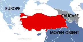 Le territoire de la république de Turquie se répartit entre l'Asie occidentale et l'Europe du Sud-Est. La partie asiatique de la Turquie, soit 97 % de la superficie totale et 83 % de la population, s'étend sur la presqu'île anatolienne (dont l'ancienne Asie mineure), le haut-plateau arménien et le nord de la plaine mésopotamienne. La partie européenne de la Turquie, située à l'ouest du détroit du Bosphore et du détroit des Dardanelles, est appelée Trakya en turc : c'est la partie orientale de la Thrace. Elle correspond à 3 % de la superficie totale de la Turquie[1] mais regroupe 17 % de sa population : dans la partie européenne de l'agglomération d'Istanbul on trouve plus d'habitants que dans n'importe quel État des Balkans et un tiers de la population de la péninsule balkanique[2].