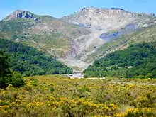 Les différentes couleurs montrent les différentes roches qui composent la montagne Ritagli di Lecca vue de Fondachelli Fantina, Sicile.