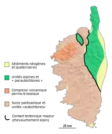 - à l'ère Paléozoïque, la Corse fait partie du sud de la chaîne hercynienne, comme en témoignent ses nombreux granites et la caldeira volcanique du Cinto. Quelques lambeaux de calcaires siluriens subsistent près de Galéria, tandis qu'au Carbonifère-Permien de petits bassins piègent des sédiments détritiques parfois porteurs de charbon (Osani).