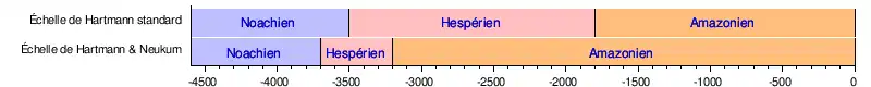 Cette chronologie en trois époques est aujourd'hui bien acceptée — la datation de chacune de ces époques demeure, en revanche, très incertaine — et permet de rendre compte des phénomènes observés à la surface de Mars par les différentes sondes en activité autour de cette planète, notamment la présence simultanée de minéraux, formés à des époques différentes, supposant pour les uns un environnement très humide et pour les autres au contraire l'absence totale d'eau liquide. Les datations proposées pour ces trois époques — ou éons — géologiques, selon l'échelle de Hartmann standard et l'échelle de Hartmann & Neukum, sont les suivantes (âges en millions d'années) :