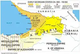 Durant l'antiquité, les Géorgiens étaient connus des Grecs et des Romains sous le nom de Colchidiens ou Ibères du Caucase[26],[27]. Les tribus géorgiennes orientales Tibarènes (en) formèrent un royaume au VIIe siècle av. J.-C. Cependant, les tribus géorgiennes occidentales (Mushkis, Svanes, Mingréliens…) formèrent la Colchide bien avant le Royaume d'Ibérie, déjà bien en place au XVIIe siècle av. J.-C.[28]. Les chroniques juives mentionnent les Géorgiens ou Ibères sous le nom de Thobel (voir Tubal)[29]. Les Colchidiens et les Ibères ont joué les rôles principaux dans l'ethnogénèse du peuple géorgien actuel[30],[31]