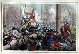 Cependant, Gênes écrase la flotte de Pise lors de la plus grande bataille navale du Moyen Âge, la bataille de la Meloria (1284). Le , près de l'îlot dit de la Meloria, les 88 galères d'Oberto Doria affrontent les 103 galères de Pise commandées par le podestat vénitien, Alberto Morosini. La victoire de Gênes est totale. Pour Pise, la défaite est catastrophique : non seulement elle déplore 5 000 tués, 9 000 prisonniers et sept galères coulées mais la cité perd à tout jamais son indépendance et sa puissance.