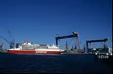 La construction du Superfast V débute à Kiel courant 1999 et le navire est lancé en 2000. Mais au cours des travaux d'achèvement, le constructeur allemand rencontrera plusieurs difficultés. En plus d'un important retard pris dans la construction, qui compromet la livraison du navire pour juillet 2000 comme initialement prévu, un incident survient lors des essais en mer du car-ferry le 25 août, lorsqu'une défaillance au niveau du transmetteur de puissance provoque l'arrêt automatique des machines. Le Superfast V, de même que son jumeau, équipé du même système, restent alors au chantier pour une durée supplémentaire le temps de corriger le défaut de fabrication de l'appareil conçu par la société De Schelde. Ce contretemps occasionne pour le chantier des pertes de plus de 400 millions de deutschemarks. Alors qu'en novembre, les navires sont prêts à être livrés, il est constaté que leur tirant d'eau se révèle plus profond que ce qui était prévu à l'origine dans le contrat de construction. Ce défaut entraînerait alors une consommation plus élevée de carburant. Superfast exige alors la correction du vice, faute de quoi le chantier serait tenu pour responsable.