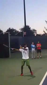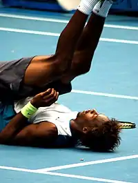 La saison 2011 de Gaël Monfils débute au tournoi d'exhibition de Kooyong, où il bat le no 9 mondial et tenant du titre Fernando Verdasco 4-6, 7-65, 6-4. La semaine suivante, après un premier tour difficile où il bat difficilement Thiemo de Bakker en cinq sets (65-7, 2-6, 7-5, 6-2, 6-1), il chute au troisième tour de l'Open d'Australie contre Stanislas Wawrinka (64-7, 2-6, 3-6)[36]. À l'entame de la saison nord-américaine sur dur, il atteint le dernier carré de l'Open de San José mais déclare forfait contre Milos Raonic à cause d'une blessure au poignet qui le force à s'arrêter deux mois.