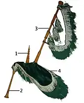 Le bourdon (ručilo, qui signifie celui qui bourdonne - comme un insecte par exemple) est en 3 parties emboîtées. Il sonne à une octave plus une quinte en dessous (une 12e) de la note la plus grave du tuyau mélodique. Le tuyau d'insufflation s'appelle duhalo (du verbe duham, souffler). Les souches qui relient les tuyaux au réservoir sont appelées glava, ce qui veut dire « tête ». Elles sont placées à l'équivalent de la tête et des pattes antérieures de l'animal. Certaines particularités sont notables :