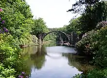 Le pont Rakotzbrücke au Parc d'azalées et de rhododendrons de Kromlau