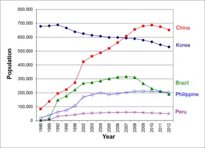 Le Japon comptait 2 217 000 étrangers à la fin 2008, soit 1,74 % de la population totale, avec une augmentation de 50 % en dix ans. Le nombre d'étrangers a baissé pour la première fois depuis 48 ans en 2009 avec 2,19 millions de personnes, soit 1,4 % de moins qu'en 2008[1].