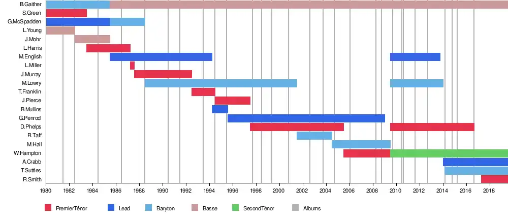 En octobre 2013, Mark Lowry et Michael English annoncent leur départ car ils souhaitaient se concentrer sur leur carrière solo[6]. Heureusement pour les fans, English et Lowry partent de la formation en leur laissant un dernier album, Hymns, sorti en mars 2014. En janvier de la même année, Adam Crabb (The Crabb Family) rejoint le groupe en tant que quatrième membre[7], suivi de Todd Suttles comme cinquième membre et baryton[8]. Ce nouveau quintette sort un nouvel album en octobre 2014 : Sometimes It Takes a Mountain, puis un album live Happy Rhythm en 2015.