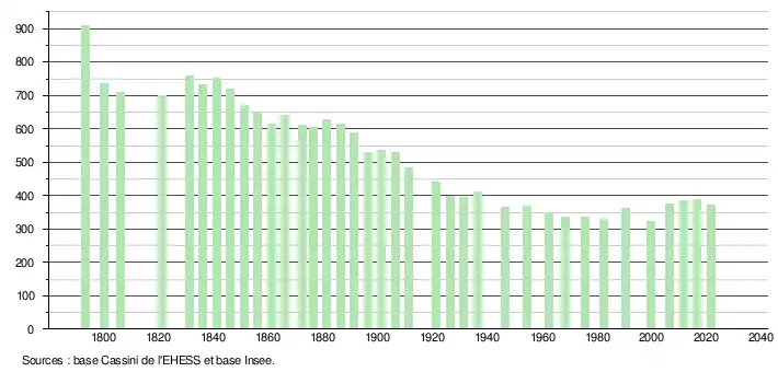 L'évolution du nombre d'habitants est connue à travers les recensements de la population effectués dans la commune depuis 1793. Pour les communes de moins de 10 000 habitants, une enquête de recensement portant sur toute la population est réalisée tous les cinq ans, les populations légales des années intermédiaires étant quant à elles estimées par interpolation ou extrapolation[24]. Pour la commune, le premier recensement exhaustif entrant dans le cadre du nouveau dispositif a été réalisé en 2006[25].