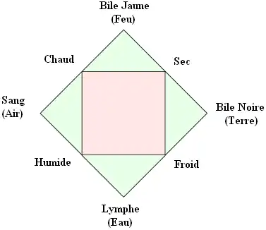 La pensée physique de Galien repose sur une théorie de la constitution de la matière héritée des plus grands penseurs de la Grèce antique. Le corps comme toute matière, est composé de quatre éléments (le feu, l'air, la terre, l'eau[n 20]) en proportion plus ou moins grande, ce qui explique la qualité plus ou moins dominante du corps (quatre qualités élémentaires : chaud, froid, humide, sec). Galien précise que sous ce terme d'élément (stoicheia), il ne s'agit pas, d'élément en soi (le « feu ») ni de la qualité pure (le « chaud ») mais de celle qui est dominante dans un corps particulier[3]. Dans les corps, les éléments ou les qualités se présentent toujours mélangés (crase κρᾶσις).