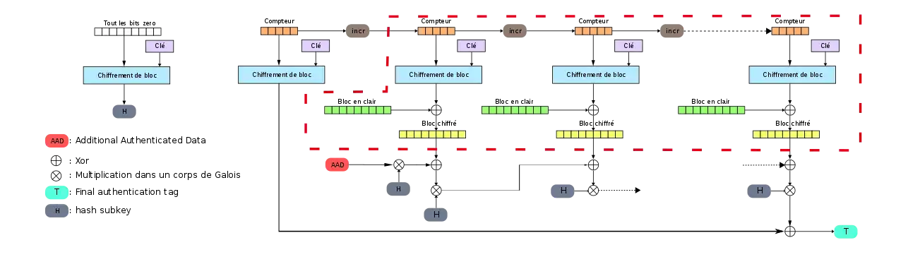 C'est un algorithme de chiffrement authentifié conçu pour fournir à la fois l'intégrité et l'authenticité des données, ainsi que la confidentialité. Le chiffrement utilisé est basé sur un compteur (mode CTR) dans lequel la multiplication entre le compteur et la clef de 128 bits est effectuée dans le corps fini F2[X] / < X128 + X7 + X2 + X + 1 >.
