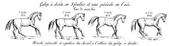 - Le galop d'école : galop à trois temps, très ralenti et un peu cadencé[2] ;