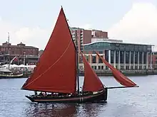 - un gréement en cotre : un mât portant une grand-voile à corne avec une longue bôme et deux focs : un foc amurés sur un beaupré et une trinquette[3].