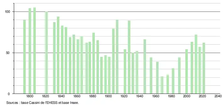 L'évolution du nombre d'habitants est connue à travers les recensements de la population effectués dans la commune depuis 1793. Pour les communes de moins de 10 000 habitants, une enquête de recensement portant sur toute la population est réalisée tous les cinq ans, les populations légales des années intermédiaires étant quant à elles estimées par interpolation ou extrapolation[17]. Pour la commune, le premier recensement exhaustif entrant dans le cadre du nouveau dispositif a été réalisé en 2006[18].