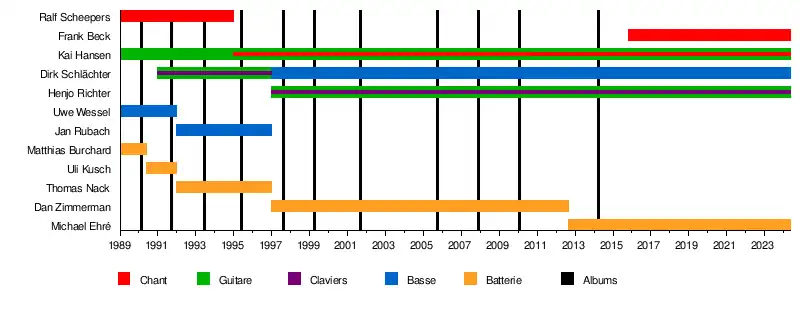 Le 31 octobre 2015, le groupe annonce sur sa page officielle l'arrivée d'un nouveau chanteur, Frank Beck[11],[12]. Il semble que Kai Hansen ait à présent du mal à assurer les tours de chant complets : le nouveau venu doit permettre à Kai de reposer sa voix, mais également de libérer son jeu de scène et se concentrer sur la partie guitare, « ce qu'il aime beaucoup ». « Ce gars peut non seulement chanter, mais également faire la fête, ce qui est très important »[réf. nécessaire]. Sur la tournée Best of the Best, Kai et Frank alternent couplets et chansons, et chantent en duo sur certains titres. En novembre 2015, Scheepers revient sur scène avec le groupe pour la première fois depuis son départ en 1994[3].