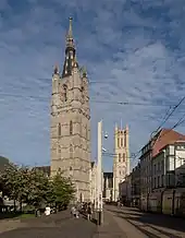 Les trois tours du centre-ville : l'actuelle cathédrale, le beffroi et l'église Saint-Nicolas. Les tours des deux églises étaient surmontées de très hautes flèches aujourd'hui disparues.