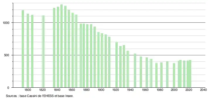 L'évolution du nombre d'habitants est connue à travers les recensements de la population effectués dans la commune depuis 1793. Pour les communes de moins de 10 000 habitants, une enquête de recensement portant sur toute la population est réalisée tous les cinq ans, les populations légales des années intermédiaires étant quant à elles estimées par interpolation ou extrapolation[22]. Pour la commune, le premier recensement exhaustif entrant dans le cadre du nouveau dispositif a été réalisé en 2008[23].