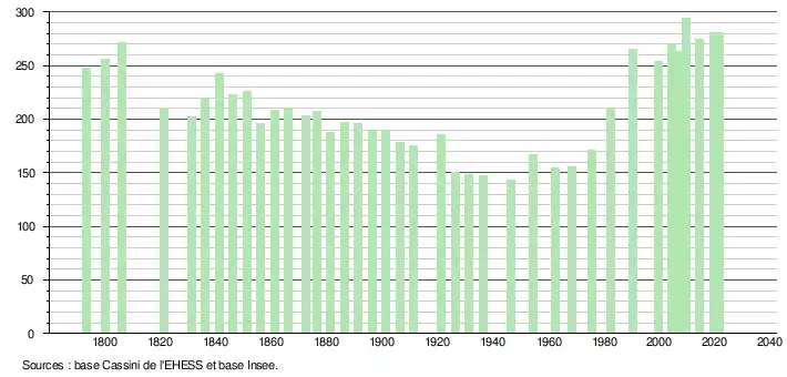 L'évolution du nombre d'habitants est connue à travers les recensements de la population effectués dans la commune depuis 1793. Pour les communes de moins de 10 000 habitants, une enquête de recensement portant sur toute la population est réalisée tous les cinq ans, les populations légales des années intermédiaires étant quant à elles estimées par interpolation ou extrapolation[23]. Pour la commune, le premier recensement exhaustif entrant dans le cadre du nouveau dispositif a été réalisé en 2004[24].