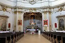 L'intérieur de l'église consiste en un espace ovale avec un chœur à peu près transversal et deux pièces annexes. Les décorations de style rococo sont blanches et dorées et centrées sur la coupole ovale. Le tableau du maître-autel, représentant le Christ en croix, est une œuvre de Peter Strudel. À côté, il y a deux autels latéraux dans des cadres de retables simples et marbrés. Le tableau d'autel latéral gauche montre la mort de saint Joseph ; il a été réalisé avant 1742 et est signé Ignaz D. Heinitz ; celui de droite est probablement italien, représente Sainte Elisabeth, et date du milieu du XVIIe siècle. Dans la sacristie se trouvent une pietà de la deuxième moitié du XVIIe siècle ainsi qu'un crucifix en bois du milieu du XVIIIe siècle.