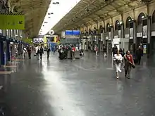 Vue intérieure (salle d'attente) de la gare Saint-Lazare (1845). Au loin, l'« embarcadère » place de l’Europe.