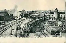 La gare d'Angoulême, ou gare du PO, d'où son nom, gare d'Orléans, a été construite incorporant une partie de l'ancien Collège royal de la Marine et inaugurée officiellement le 10 octobre 1852 par Napoléon III[4]. La gare de la Compagnie des Charentes qui deviendra gare de l'État, est construite de l'autre côté de l'avenue Gambetta. Cette gare hébergeait initialement le trafic entre Saintes, Angoulême et Limoges, dont la ligne a été inaugurée en 1875 (un deuxième tunnel sous la ville a dû être creusé, aujourd'hui tunnel routier)[5]. Ce bâtiment modeste, qui devait avoir un étage qui n'a jamais été construit a été détruit par un bombardement durant la Seconde Guerre mondiale.
