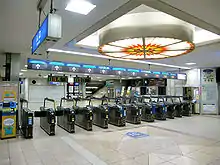 Entrée de la gare et sa rangée de poinçonneuses automatiques.