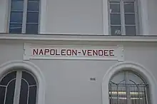 - En 1804 La Roche-sur-Yon est préférée, par Napoléon, à Fontenay, considérée comme trop excentrée, pour devenir un chef-lieu. Pour être à la hauteur de ce choix, la petite localité est totalement reconstruite pour devenir une « importante citée administrative et militaire. Elle est renommée Napoléon Vendée en 1852 »[3]. Elle conserve ce nom tout le Second Empire et ce nom est toujours inscrit sur le bâtiment de la gare.