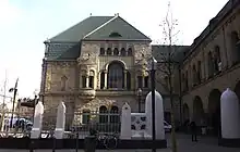 Le projet est confié à l’architecte berlinois Jürgen Kröger. Édifice résolument fonctionnel, la nouvelle gare monumentale doit répondre à la fois aux besoins des services ferroviaires et aux attentes des usagers[6]. Le bâtiment voyageurs, long de plus de 300 mètres et dont la tour de l’horloge s’élève à 40 m, est édifié de 1905 à 1908 par Jürgen Kröger, assisté des architectes Peter Jürgensen (de) (1873-1954) et Jürgen Bachmann (de) (1872-1951), ainsi que du sculpteur Schirmer, dans un style néo-roman rhénan[7]. Le décor sculpté des façades évoque les conquêtes de la Civilisation et la puissance de l'Empire allemand[6]. La gare est inaugurée le [8]. Le coût final de la construction s'élève à vingt-neuf millions de marks-or[9], alors que le cahier des charges initial, prévoyait un budget de 2 190 000 marks-or[10].