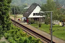 Bâtiment voyageurs et halte, avec le château de Bourscheid à l'arrière-plan. | |