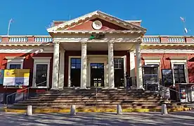 Le bâtiment de la gare est de style néoclassique d'un seul étage. Sa structure est symétrique: dans la partie centrale se trouve l'entrée principale, sur quelques marches, formée par un porche à 4 colonnes de style dorique et complétée par un fronton avec une rosace au milieu. Sur les deux côtés, il y a une porte encadrée par des volutes[3].