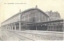 La première gare est rapidement débordée par le trafic engendré par la cité textile spécialisée dans la laine à la Belle Époque. Ainsi, l'actuelle gare de Tourcoing est construite en 1905, grâce à une signature de convention entre la Compagnie des chemins de fer du Nord et la municipalité. Située sur une place alors très fréquentée et à quelques minutes du centre-ville, on va y trouver une gare de voyageurs, et des voies extérieures vouées au transport de marchandises. L'architecte Sidney Dunnett s'est inspiré d'une de ses réalisations, la gare de Roubaix, dans la ville voisine, et ajoute une cour pavée. On y retrouve le même style néo-Louis XIII, qui se prête bien à la région du fait de l'usage de la brique, ainsi que le même hall central accueillant les voyageurs, présentant en façade un important pignon métallique vitré, cerné de piles de briques et de pierres et surmonté d'une horloge. Le bâtiment central, comportant une façade longue de 110 mètres[3], est complété par deux corps annexes, séparés du hall par deux constructions basses percées de baies en arc bombé, comptant chacune dix travées. Les pavillons latéraux sont couronnés par une haute mansarde, d'où émergent des cheminées en brique. Des pilastres, sur lesquels alternent la pierre et la brique, scandent les façades. L'un des pavillons accueillait un hôtel, l'autre un bureau de poste. La composition de cette façade, réalisée par l'architecte Ligny, répond à la place prenant une forme en trident[4],[3]. On y trouvait également un restaurant avec buffet, des logements, des bureaux, une salle d'attente, un télégraphe et une douane (car Tourcoing fut une importante gare frontière). Jouxtant les façades donnant sur les voies ferrées, une grande halle métallique abritait les quais[5],[3].