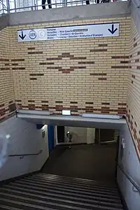 Panneaux indicateurs avec nom de la station et de la correspondance vers la ligne 6 du métro.