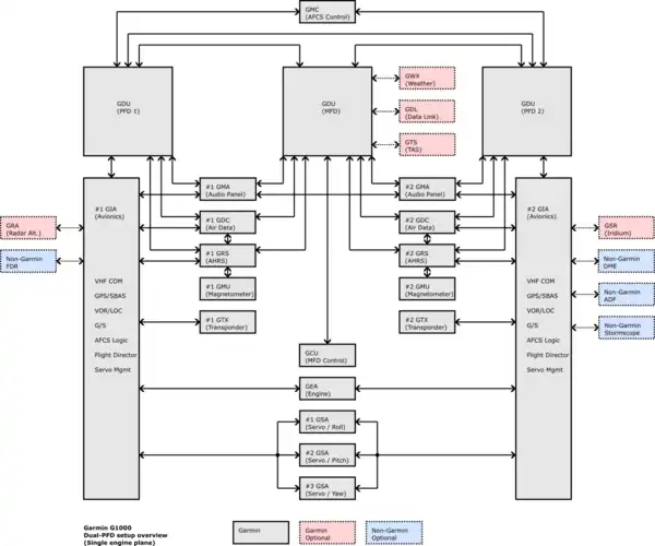 Le G1000 est un système modulaire. Il se compose typiquement de deux écrans, ou Garmin Display Unit (GDU), appelés Primary Flight Display (PFD) et Multi-Function Display (MFD) ainsi que d'un module de communication situé entre ces écrans. Les GDU peuvent être de différentes tailles: 10, 12 ou 15 pouces.