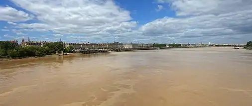 À Bordeaux, le fleuve est très large et sous l'influence des marées. À marée montante se forme un mascaret qui remonte le fleuve[19],[20],[21]. L'eau salée de l'océan remonte à Bordeaux en période d'étiage[17], quand le mascaret peut être observé jusqu'en amont de Cadillac en périodes de grandes marées.