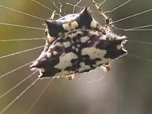 L'abdomen est plus ou moins octogonal, plus large que long[7], et chevauche fortement en avant le céphalothorax[2]. Il est recouvert de duvet et de poils. La partie dorsale est légèrement concave, avec des taches jaunâtres à blanchâtres et quelques paires de grandes sigilla bien visibles[2]. Les quatre sigilla de la rangée antérieure sont ovales et les deux médians légèrement vers l’intérieur. Les deux sigilla latéraux sont placés sur le bord avant et un sigilla est placé entre les deux épines latérales, tous larges et ovales. Les deux sigilla latéraux du bord arrière sont un peu plus petits et plus ovales. Le sigilla externe des cinq médians est situé sur le bord postérieur, les trois autres restant assez rapprochés au milieu et plus à l’intérieur[7]. L’angle du côté avant et les deux du bord arrière sont brun-noir[7]. Les paires de plaques sombres sont noires aux frontières et peuvent être interconnectées ou non[12]. Les quatre épines latérales sont très petites[7]. Les épines médianes et postérieures sont de taille inférieure à l'égale aux épines antérieures mais beaucoup plus larges[2]. La face ventrale est noirâtre, avec des taches éparses jaunâtres à blanchâtres et un tubercule cornu en avant des filières. L'épigyne présente un scape très court[2].