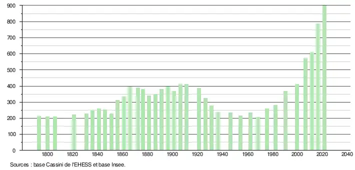 L'évolution du nombre d'habitants est connue à travers les recensements de la population effectués dans la commune depuis 1793. Pour les communes de moins de 10 000 habitants, une enquête de recensement portant sur toute la population est réalisée tous les cinq ans, les populations légales des années intermédiaires étant quant à elles estimées par interpolation ou extrapolation[33]. Pour la commune, le premier recensement exhaustif entrant dans le cadre du nouveau dispositif a été réalisé en 2006[34].