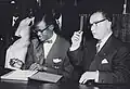 Gaston Eyskens à une conférence du gouvernement Benelux dans le bâtiment du Congrès, La Haye,