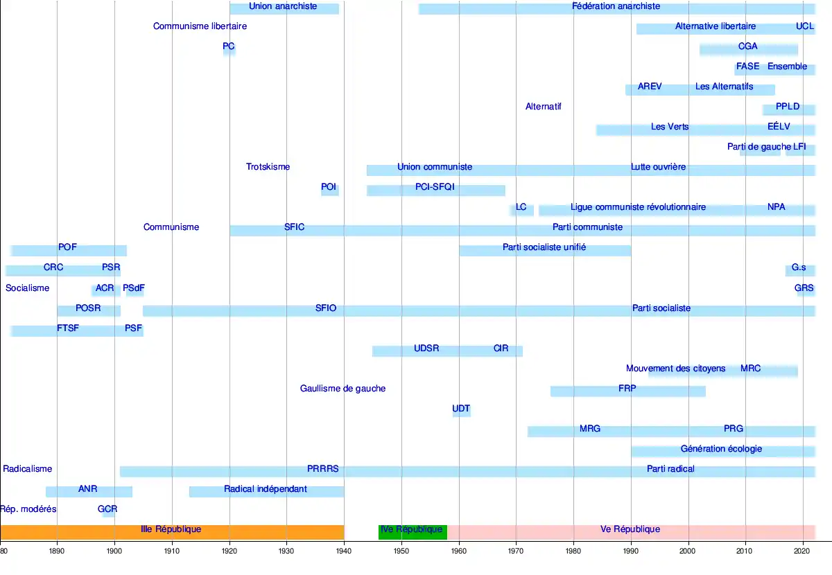 Michel Winock retient quatre familles au sein de la gauche, considérées, selon les partis politiques contemporains[4], au travers des révolutions dont ils sont à l'origine[5] : la gauche républicaine, la gauche socialiste, la gauche communiste et l'ultragauche[5].