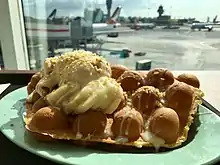 - gaufre de Hong Kong : après cuisson, nappée de beurre, beurre d'arachide et de sucre, puis pliée en deux pour la dégustation ;