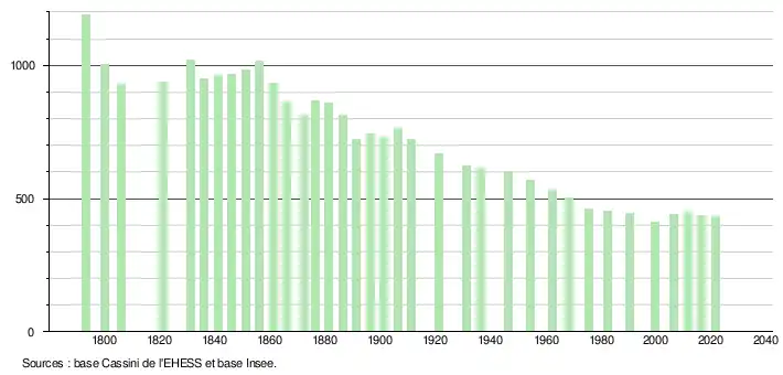 | L'évolution du nombre d'habitants est connue à travers les recensements de la population effectués dans la commune depuis 1793. Pour les communes de moins de 10 000 habitants, une enquête de recensement portant sur toute la population est réalisée tous les cinq ans, les populations légales des années intermédiaires étant quant à elles estimées par interpolation ou extrapolation[22]. Pour la commune, le premier recensement exhaustif entrant dans le cadre du nouveau dispositif a été réalisé en 2006[23]. En 2021, la commune comptait 434 habitants[Note 2], en diminution de 1,36 % par rapport à 2015 (Landes : +4,9 %, France hors Mayotte : +1,84 %). |