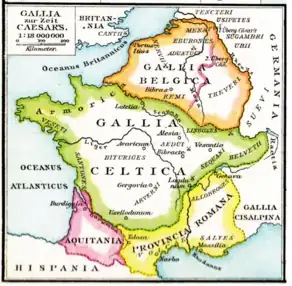 Au milieu du Ier siècle av. J.-C. Jules César divise la Gaule transalpine en trois parties : la Gaule celtique, la Gaule aquitaine et la Gaule belgique (cf. carte). Ce découpage schématique correspondait à des considérations géopolitiques propres aux Romains, Strabon qui fournit des délimitations différentes le précise en au moins deux occasions[24],[25]. Si la Gaule proprement dite apparaît sous la plume des Romains, elle trouve sa définition arbitraire actuelle à travers l'histoire de sa conquête par ces derniers. La Gaule est en effet une pure invention de César voulant que sa conquête soit perçue comme un ensemble homogène, doté d'une frontière qualifiée de naturelle mais qui n'a aucun sens, le Rhin, fleuve délimitant un nouveau territoire qu'il nomme Germanie[26].