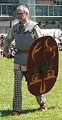 Enfin le bouclier : de forme ovale, d'environ 150 à 160 cm de haut et de 50 à 60 cm de large, il est en bois. Le détail de sa structure sera vu plus bas. Percé en son centre pour y placer la main, un manipule horizontal placé sur le centre de gravité permet une manipulation aisée d'une main de manière défensive comme offensive. Le plateau est renforcé par une spina en bois qui a aussi un rôle de protection de la main. Le tout est fixé et blindé par un umbo en fer et des rivets. (Voir photos)
