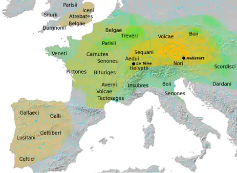 Archéologiquement, les Gaulois étaient porteurs des cultures de Hallstatt (en partie) et de la Tène, qui s'étendaient à travers toute la Gaule, ainsi qu'à l'est de la Rhérie, le Norique, la Pannonie et le sud-ouest de la Germanie du Ve siècle av. J.-C. au Ier siècle av. J.-C. La Gaule tomba sous domination romaine au cours d'une période allant du IIe siècle av. J.-C. au Ier siècle av. J.-C. : la Gaule Cisalpine fut conquise en -203 et la Gaule narbonnaise en -123. La Gaule fut envahie après -120 par les Cimbres et les Teutons, qui furent à leur tour vaincus par les Romains en -103. Jules César conquit finalement les parties restantes de la Gaule (qu'il considère comme divisée en trois parties : Gallia Celtica, Belgica et Aquitania) dans ses campagnes de -58 à -51. Quant à l'Aquitaine césarienne, elle se différencie du reste de la Gaule par son assise linguistique basque-aquitaine[5].