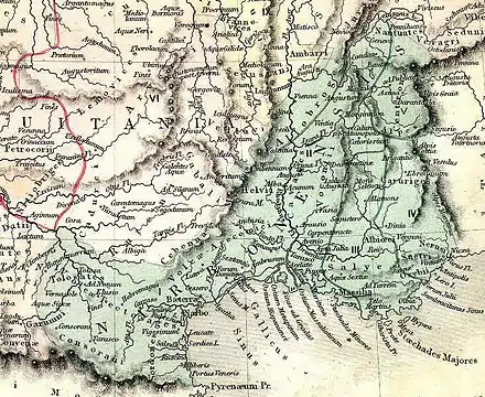 À l'ouest de la Narbonnaise, se trouve la région de Gaule que les Romains appellent Aquitaine[1], au sud et à l'ouest de la Garonne, où le peuplement est marqué par la civilisation basque (cf. le nom ancien d'Auch : Elimberri), bien qu'il y ait aussi des Celtes (Lugdunum Convenarum, Saint-Bertrand-de-Comminges). Les peuples limitrophes en Aquitaine sont les Convènes (Saint-Bertrand-de-Comminges) et les Ausques (Auch).