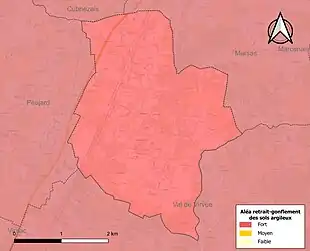 Le retrait-gonflement des sols argileux est susceptible d'engendrer des dommages importants aux bâtiments en cas d’alternance de périodes de sécheresse et de pluie. La totalité de la commune est en aléa moyen ou fort (67,4 % au niveau départemental et 48,5 % au niveau national). Sur les 484 bâtiments dénombrés sur la commune en 2019, 484 sont en aléa moyen ou fort, soit 100 %, à comparer aux 84 % au niveau départemental et 54 % au niveau national. Une cartographie de l'exposition du territoire national au retrait gonflement des sols argileux est disponible sur le site du BRGM[20],[Carte 2].